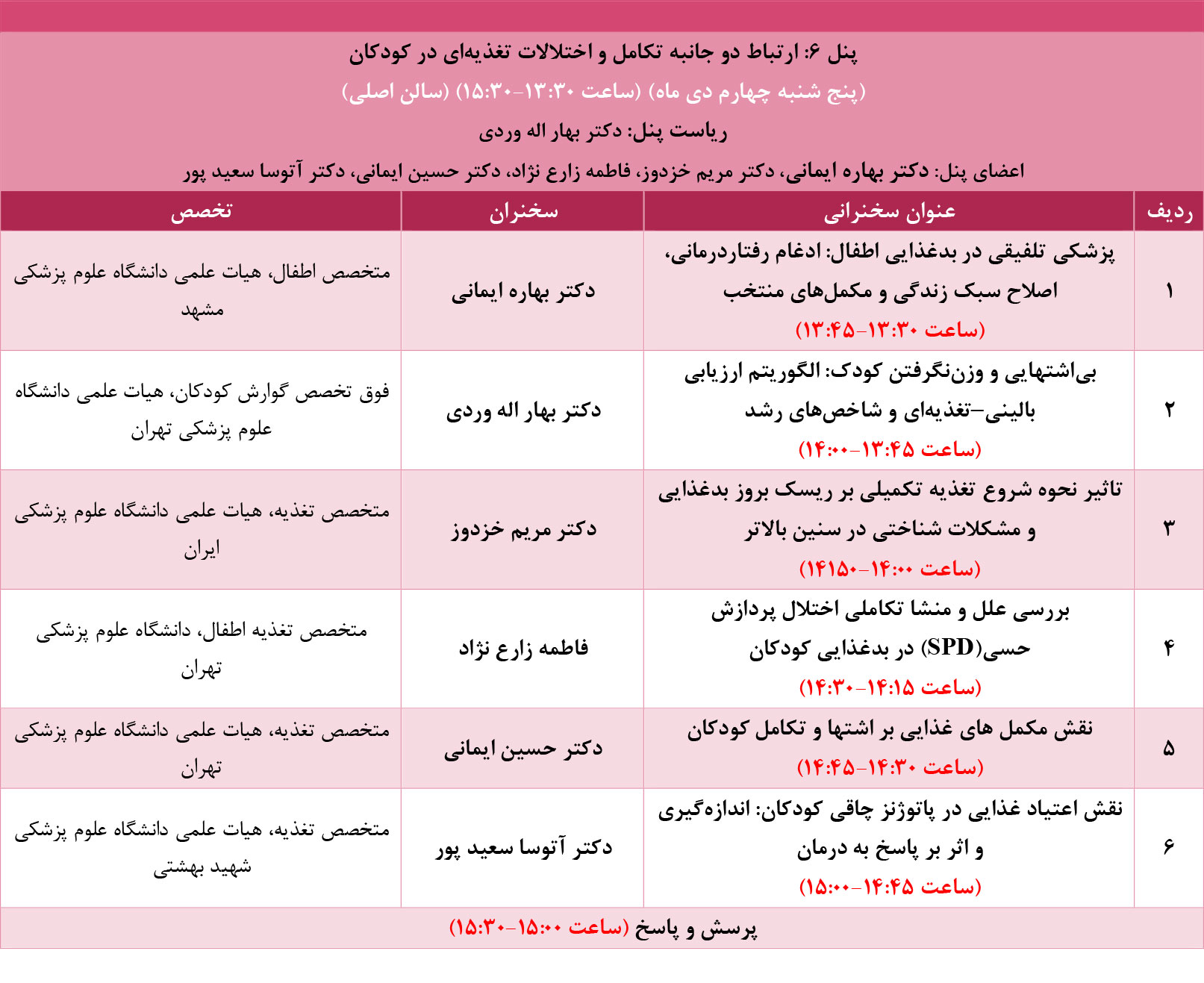 این نشست با تمرکز بر سال‌های اولیه و طلایی زندگی، به‌طور منسجم چرخه متقابل میان اختلالات تغذیه‌ای و مسیر رشد و تکامل کودک را بررسی می‌کند. در این چارچوب، ابتدا «پزشکی تلفیقی در بدغذایی اطفال» معرفی می‌شود و نشان داده می‌شود که چگونه ادغام رفتاردرمانی، اصلاح سبک زندگی خانواده و استفاده هدفمند از مکمل‌های منتخب می‌تواند از تثبیت الگوهای بدغذایی مزمن در اوایل کودکی پیشگیری کند. سپس «بی‌اشتهایی و وزن‌نگرفتن کودک» در قالب یک الگوریتم ساختارمند ارزیابی بالینی–تغذیه‌ای و با تأکید بر شاخص‌های خطر برای رشد و تکامل، مورد بحث قرار می‌گیرد تا تمایز میان علل خوش‌خیم، روان‌تنی و اختلالات شدیدتر روشن شود. در ادامه، تأثیر نحوه شروع تغذیه تکمیلی، زمان‌بندی، تنوع و بافت غذا بر ریسک بدغذایی و پیامدهای رشدی مرور شده و بر نقش آموزش والدین در این دوره حساس تأکید می‌شود. محور بعدی پنل به بررسی علل و منشأ تکاملی اختلال پردازش حسی (SPD) و سهم آن در امتناع غذایی و تداوم بدغذایی در کودکان خردسال اختصاص دارد و جایگاه ارزیابی و مداخله کاردرمانی حسی در بسته مراقبتی کودک روشن می‌گردد. نقش مکمل‌های غذایی در بهبود اشتها و حمایت از رشد و تکامل، همراه با مرور شواهد اثربخشی و ملاحظات ایمنی، به‌صورت نقادانه تحلیل می‌شود و در پایان، مفهوم «اعتیاد غذایی» در پاتوژنز چاقی کودکان و اثر آن بر پاسخ به مداخلات رفتاری–تغذیه‌ای بررسی می‌گردد تا چارچوبی عملی برای طراحی برنامه‌های چندبعدی و پیشگیرانه–درمانی در حوزه تغذیه و تکامل کودکان فراهم آید.