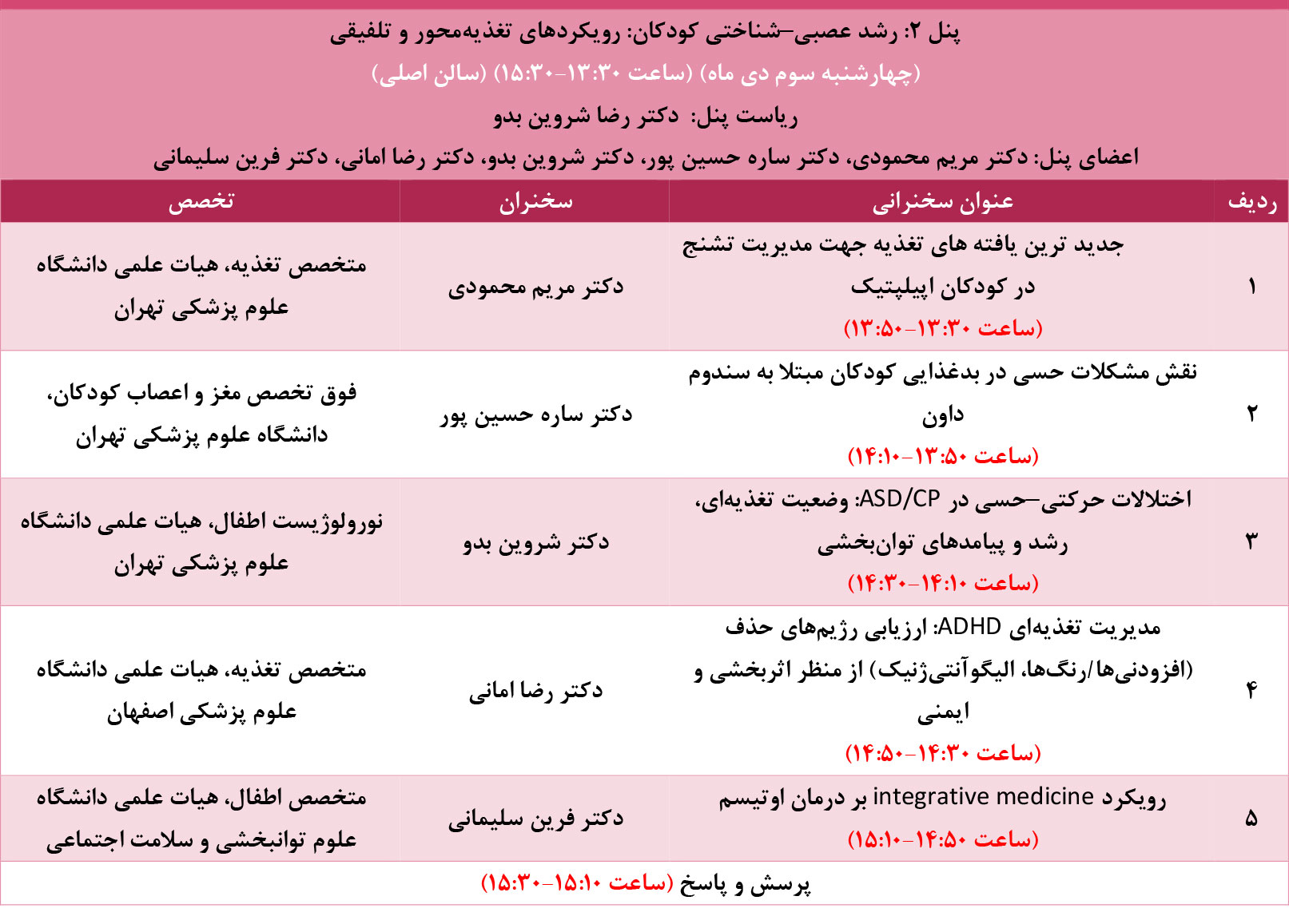 این نشست با تمرکز بر سال‌های اولیه و میانی کودکی، به نقش تغذیه و مداخلات تلفیقی در شکل‌دهی مسیر رشد عصبی–شناختی و عملکرد رفتاری کودکان می‌پردازد. در گام نخست، جدیدترین شواهد مربوط به مداخلات تغذیه‌ای در مدیریت تشنج کودکان اپیلپتیک مرور می‌شود و نشان داده می‌شود که چگونه انتخاب و پایش رژیم‌های تخصصی می‌تواند علاوه بر کنترل حملات، از آسیب‌های ثانویه بر تکامل شناختی و کیفیت زندگی در سال‌های طلایی رشد پیشگیری کند. سپس نقش مشکلات حسی در بدغذایی کودکان مبتلا به سندرم داون و تأثیر آن بر وضعیت تغذیه‌ای، رشد جسمی و مشارکت در برنامه‌های توان‌بخشی مورد تحلیل قرار می‌گیرد. بخش بعدی به اختلالات حرکتی–حسی در کودکان مبتلا به ASD و CP می‌پردازد و تعامل این مشکلات با وضعیت تغذیه‌ای، رشد و پیامدهای توان‌بخشی را در قالب یک رویکرد تیمی نورولوژی–تغذیه–توان‌بخشی تبیین می‌کند. در ادامه، مدیریت تغذیه‌ای ADHD با تمرکز بر ارزیابی نقادانه رژیم‌های حذف (افزودنی‌ها، رنگ‌ها و الگوهای غذایی خاص) از منظر اثربخشی، ایمنی و جایگاه آن‌ها در کنار درمان‌های استاندارد مطرح می‌شود تا شرکت‌کنندگان بتوانند تصمیم‌گیری مبتنی بر شواهد داشته باشند. این پنل با ارائه رویکرد Integrative Medicine در درمان اوتیسم، شامل ادغام مداخلات تغذیه‌ای، مکمل‌ها و رویکردهای روان–بدنی در چارچوب پروتکل‌های ایمن و همسو با راهنماهای علمی، به پایان می‌رسد و در مجموع، مسیری روشن برای استفاده مسئولانه و هدفمند از تغذیه و پزشکی تلفیقی در حمایت از رشد عصبی–شناختی کودکان در سال‌های اولیه و حساس زندگی ترسیم می‌کند.